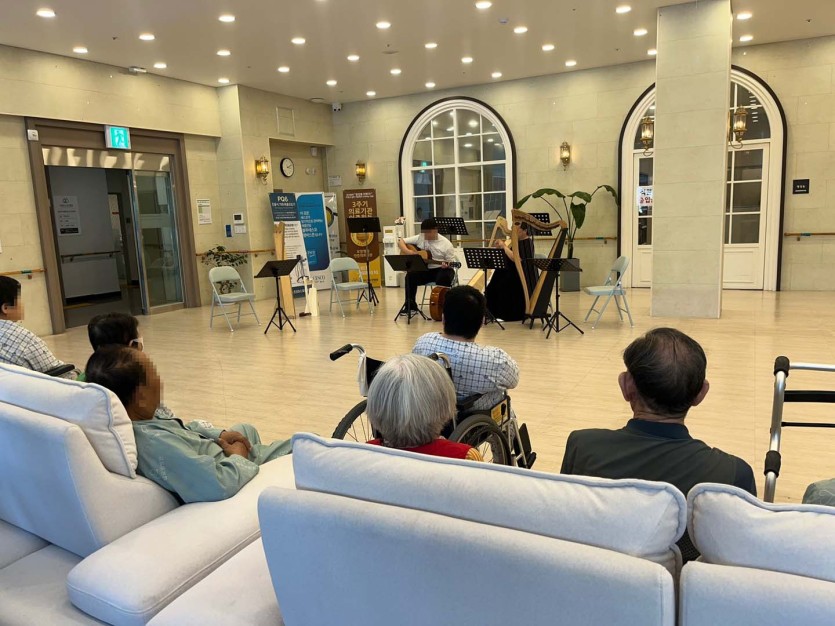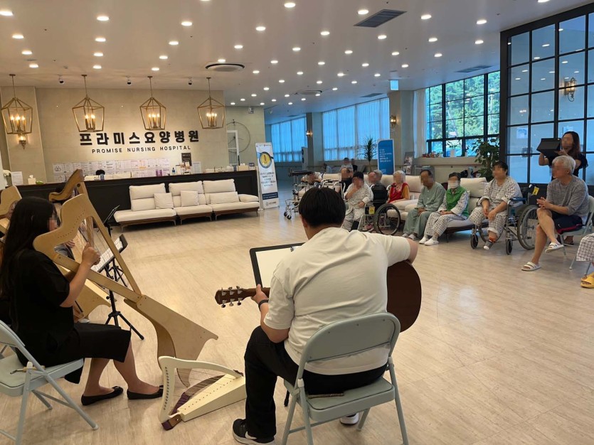하프, 바이올린, 플루트, 첼로, 기타 등 다채로운 악기의 하모니로 환자분들에게 잊지 못할 감동을 전해드렸고, 연주에 맞춰 손뼉을 치시며 환하게 웃으시며 즐겨주셨습니다.