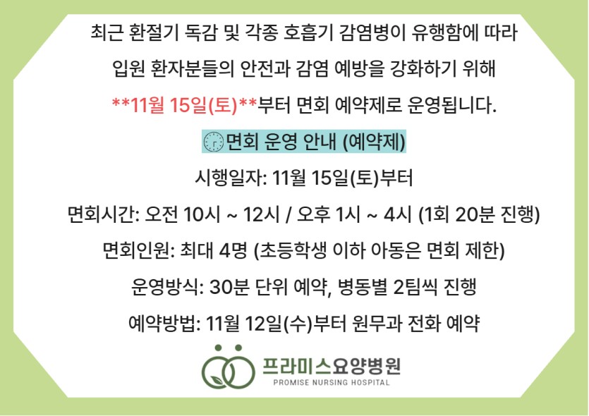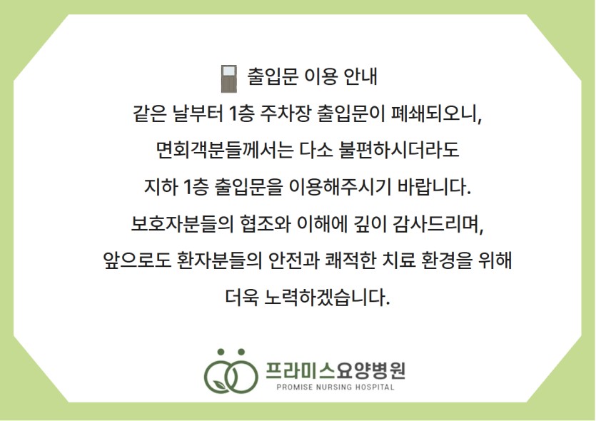 면회 안내드립니다. 페이지 정보 작성자 프라미스요양병원 댓글 0건 조회 853회 작성일 25-04-14 12:11 목록 본문 면회 안내드립니다. 이전글주간 식단표 입니다. (25.12.01 ~ 25.12.07) 25.04.14 다음글프라미스요양병원 진료일정표입니다. 25.03.07 댓글 0 댓글목록 등록된 댓글이 없습니다.